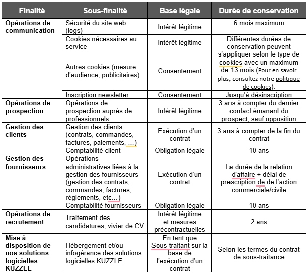 3. Finalités, bases légales et durées de conservation des traitements de données