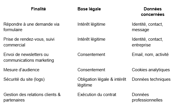 The legal basis is Kuzzle’s legitimate interest in developing its commercial activity. Consent may be required for certain marketing operations (e.g. newsletters).